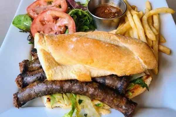 Lamb and beef Tunisian sausage in a baguette with fries or vegetables and your choice of salad.